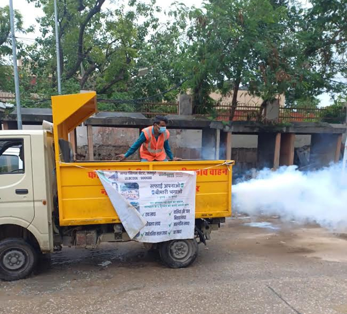 जयपुर। नगर निगम ग्रेटर आयुक्त डॉं. गौरव सैनी के निर्देशानुसार मलेरिया शाखा द्वारा सम्पूर्ण ग्रेटर क्षेत्र के 150 वार्डो में मौसमी बीमारियों मलेरिया, डेंगू एवं चिकनगुनिया की रोकथाम हेतु तत्परता से फोगिंग कार्य 06 व्हीकल माउन्टेड 08 पोर्टेबल फोगिंग मशीन द्वारा करवाया जा रहा है। इसके साथ कीटनाशक छिडकाव कार्य एवं रूके हुऐ पानी में एन्टीलारवा एक्टीविटिज का कार्य प्रभावी रूप से नियमित करवाया जा रहा है।