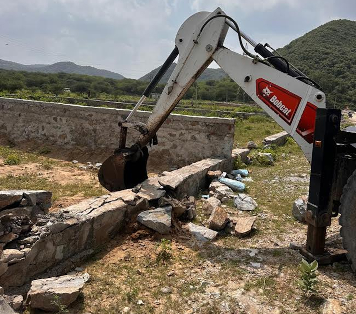जेडीए द्वारा जोन-02 के क्षेत्राधिकार में अवस्थित ग्राम आखेड़ा डूंगर, तहसील आमेर, जिला जयपुर के खसरा नं. 913 से 916, 930, 936, 946 व 1469 में करीब 17 बीघा कृषि भूमि पर जेडीए की बिना स्वीकृति-अनुमोदन के एवं बिना भू रूपान्तरण करवायें भूमि को समतल कर बनाई गई ग्रेवल सड़के, मकान के ढांचे, टीनषेडनुमा कोठरी, प्लॉटों की बाउण्ड्रीवाल, लोहे का गेट लगाकर व अन्य अवैध निर्माण कर नवीन अवैध कॉलोनी बसाने की सूचना प्राप्त होने पर आज जोन-02 के राजस्व व तकनीकी स्टॉफ की निशादेही पर प्रवर्तन दस्ते द्वारा जेसीबी मषीन व मजदूरों की सहायता से ध्वस्त किया जाकर नवीन अवैध कॉलोनी बसाने के प्रयास को विफल किया गया।