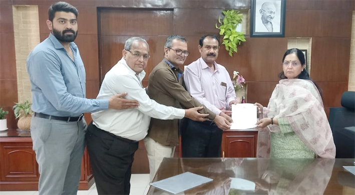 जयपुर। पशुपालन विभाग ने पिछले छः माह से मोबाइल एप के बहाने कर्मचारियों पर की जा रही दमनात्मक कार्यवाही करते हुए लगभग 30 कार्मिकों को निलंबन किए जाने के विरोध में राजस्थान आवासन बोर्ड कर्मचारी संघ के प्रान्तीय अध्यक्ष दशरथ कुमार के नेतृत्व में माननीय मुख्यमंत्री महोदय के नाम आवासन आयुक्त महोदया को ज्ञापन सौंपा। प्रतिनिधि मण्डल में प्रान्तीय अध्यक्ष के साथ महामंत्री प्रदीप शर्मा, संयुक्त महासचिव गोविंद नाटाणी, प्रचार मंत्री मनुज ठाकुर और मुख्यालय शाखा अध्यक्ष मधुर मलिक के द्वारा ज्ञापन सौंपा गया।