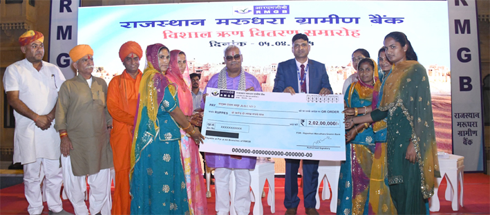 जयपुर। शिक्षा एवं पंचायती राज मंत्री मदन दिलावर ने कहा कि दुरस्थ मरुस्थलीय जैसलमेर जिले में राजस्थान मरुधरा ग्रामीण बैंक एवं राजीविका महिला स्वयं सहायता समूहों की महिलाओं को बेहतर ढंग से आत्मनिर्भर बनाने एवं उनके उत्थान की दिशा में अहम् भूमिका निभा रहा है। इस विशाल ऋण वितरण समारोह के मौके पर जिले के विभिन्न क्षेत्रों व ग्रामीण अंचलों से स्वयं सहायता समूह से जुड़ी 700 से अधिक महिलाओं ने भाग लेकर मिसाल कायम की। इन महिलाओं ने अपने जीविकोपार्जन व स्वावलम्बन बनने के लिए बैंक से ऋण प्राप्त किया था जिससे उन्हें स्वयं का व्यवसाय करने में मदद मिली।