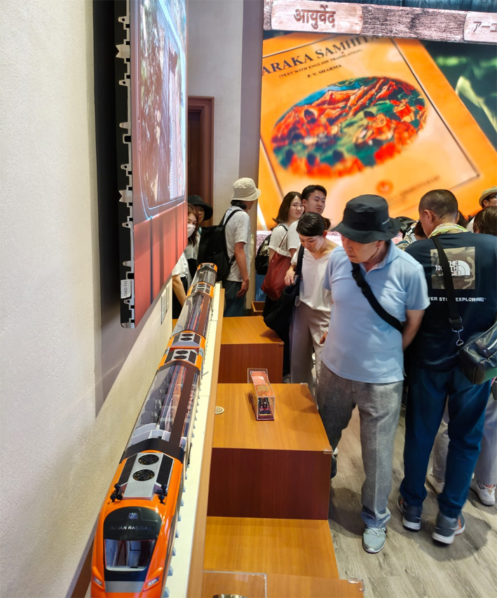 वहीं, चिनाब ब्रिज – जो दुनिया का सबसे ऊंचा रेलवे आर्च ब्रिज है। भारतीय रेल इंजीनियरिंग क्षमता का प्रतीक बनकर उभरा है। हिमालय की घाटियों में बना यह ब्रिज न केवल तकनीकी चुनौती को परास्त करता है, बल्कि भारत के उत्तर क्षेत्र में कनेक्टिविटी और सुरक्षा की दृष्टि से भी बेहद अहम है। जापानी दर्शक, खासकर इंजीनियरिंग और आर्किटेक्चर के छात्र, चिनाब ब्रिज के 3D प्रेजेंटेशन और इंटरैक्टिव मॉडल को ध्यान से देख रहे हैं और इसके निर्माण से जुड़े विवरणों को जानने में गहरी रुचि ले रहे हैं।