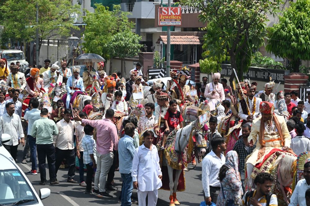 एक साथ 45 घोड़ियों पर दूल्हों की निकासी अग्रवाल केटर्स, विधाधर नगर से प्रारम्भ होकर विवाह स्थल पहुंची, द्वार पर दूल्हों का स्वागत महिला कार्यकर्ताओं द्वारा पुष्प वर्षा से किया गया। इसके बाद एक साथ सभी ने तोरण मारने की परम्परा का निर्वहन किया। इस दौरान बड़ी संख्या में वर वधु पक्ष लोगों के साथ समाज के अन्य गणमान्य नागरिक भी मोजूद रहे। तोरण के बाद सभी दूल्हा दूल्हन मंच पर पहुंचे जहां दूल्हा-दूल्हन की वरमाला संस्कार सम्पन्न कराया गया।