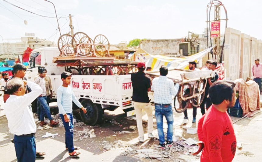 जयपुर। नगर निगम ग्रेटर आयुक्त श्रीमती रूकमणि रियाड़ के निर्देशानुसार उपायुक्त सतर्कता अजय कुमार शर्मा के नेतृत्व में सतर्कता शाखा की अस्थाई टीम द्वारा नगर निगम जयपुर ग्रेटर के क्षेत्राधिकार में मुरलीपुरा स्कीम के चारों तरफ, विद्याधर नगर स्टेडियम के पास, सिने स्टार के पास एवं लालकोठी सब्जीमण्डी के पास से अस्थाई अतिक्रमण करने वालों के विरूद्ध 33 हजार रूपये का कैरिंग चार्ज कर 3 केन्टर सामान जब्त किया।उपायुक्त सतर्कता अजय कुमार शर्मा ने बताया कि नगर निगम ग्रेटर के क्षेत्राधिकार में मुरलीपुरा स्कीम के चारों तरफ, विद्याधर नगर स्टेडियम के पास, सिने स्टार के पास एवं लालकोठी सब्जीमण्डी के पास से अस्थाई अतिक्रमण को हटाने की कार्यवाही की गई। कार्यवाही के दौरान 3 केन्टर सामान जप्त कर गोदाम में भिजवाया गया तथा मौके पर अस्थाई अतिक्रमण करने वालों से मौके पर 33 हजार रूपये का केरिंग चार्ज वसूल किया गया तथा दौरे के दौरान कार्यवाही सतर्कता टीम द्वारा मौके पर समझाईश करते हुए मौखिक पाबंद करवाया कि भविष्य में अस्थाई अतिक्रमण समय से हटा ले अन्यथा नगर निगम जयपुर ग्रेटर के क्षेत्राधिकार में अवैध अतिक्रमण करने वालों के विरूद्ध भारी चालान या प्रभावी कार्यवाही अमल में लाई जायेगी।