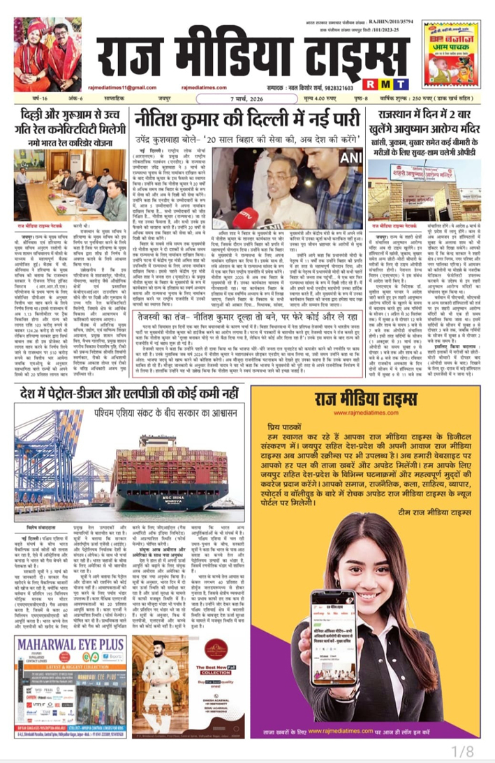 E-Paper E-Paper_(07-03-2026) Last updated: March 7, 2026 8:23 am RMT network Share 0 Min Read SHARE TAGGED:E-Paper Sign Up For Daily NewsletterBe keep up! Get the latest breaking news delivered straight to your inbox.[mc4wp_form]By signing up, you agree to our Terms of Use and acknowledge the data practices in our Privacy Policy. You may unsubscribe at any time. Share This Article Facebook Twitter Copy Link Print Share Previous Article рдЙрджреНрдпреЛрдЧрдкрддрд┐ рд╕реБрджреЗрд╢ рд╢рд░реНрдорд╛ рдХреЛ рдЬрдиреНрдорджрд┐рд╡рд╕ рдкрд░ рджреА рдмрдзрд╛рдИ Next Article рд░рд╛рдЬреНрдп рд╕рд░рдХрд╛рд░ рдХреА рдЬрдирд╣рд┐рддрдХрд╛рд░реА рдкрд╣рд▓: рдЬреЗрдбреАрдП рдЕрдм рд░рд┐рдХреНрдд рднреВрдЦрдВрдбреЛрдВ рдФрд░ рд╕реНрдерд╛рдиреЛрдВ рдХреЛ рджреЗрдЧрд╛ рдЕрд▓реНрдкрд╛рд╡рдзрд┐ рдХрд┐рд░рд╛рдпреЗ рдкрд░ Stay Connected235.3kFollowersLike69.1kFollowersFollow11.6kFollowersPin56.4kFollowersFollow136kSubscribersSubscribe4.4kFollowersFollow - Advertisement - Latest News рд░рд╛рдЬреНрдп рд╕рд░рдХрд╛рд░ рдХреА рдЬрдирд╣рд┐рддрдХрд╛рд░реА рдкрд╣рд▓: рдЬреЗрдбреАрдП рдЕрдм рд░рд┐рдХреНрдд рднреВрдЦрдВрдбреЛрдВ рдФрд░ рд╕реНрдерд╛рдиреЛрдВ рдХреЛ рджреЗрдЧрд╛ рдЕрд▓реНрдкрд╛рд╡рдзрд┐ рдХрд┐рд░рд╛рдпреЗ рдкрд░ Jaipur March 7, 2026 рдЙрджреНрдпреЛрдЧрдкрддрд┐ рд╕реБрджреЗрд╢ рд╢рд░реНрдорд╛ рдХреЛ рдЬрдиреНрдорджрд┐рд╡рд╕ рдкрд░ рджреА рдмрдзрд╛рдИ Jaipur March 7, 2026 рдлрд╝рд╛рдЗрдирд▓ рдореЗрдВ рдкрд╣реБрдВрдЪрд╛ рднрд╛рд░рдд, рдмреЗрдереЗрд▓ рдХрд╛ рд╢рддрдХ рдЧрдпрд╛ рдмреЗрдХрд╛рд░ Sports March 6, 2026 рднрд╛рд░рдд рдХреЗ рдкрд╛рд╡рд░рдлреБрд▓ рдирд╛рд░реА рдЧреНрд░реБрдк рдФрд░ рдХрд╛рд▓реА рд╕реБрдкрд╛рд░реА рджреНрд╡рд╛рд░рд╛ рдЖрдпреЛрдЬрд┐рдд тАЬInfluencer & Business Super Excellence AwardтАЭ, 101 рдкреНрд░рддрд┐рднрд╛рдУрдВ рдХреЛ рдХрд┐рдпрд╛ рдЧрдпрд╛ рд╕рдореНрдорд╛рдирд┐рдд Jaipur March 6, 2026 AdvertiseAdvertise with us Newsletters Deal