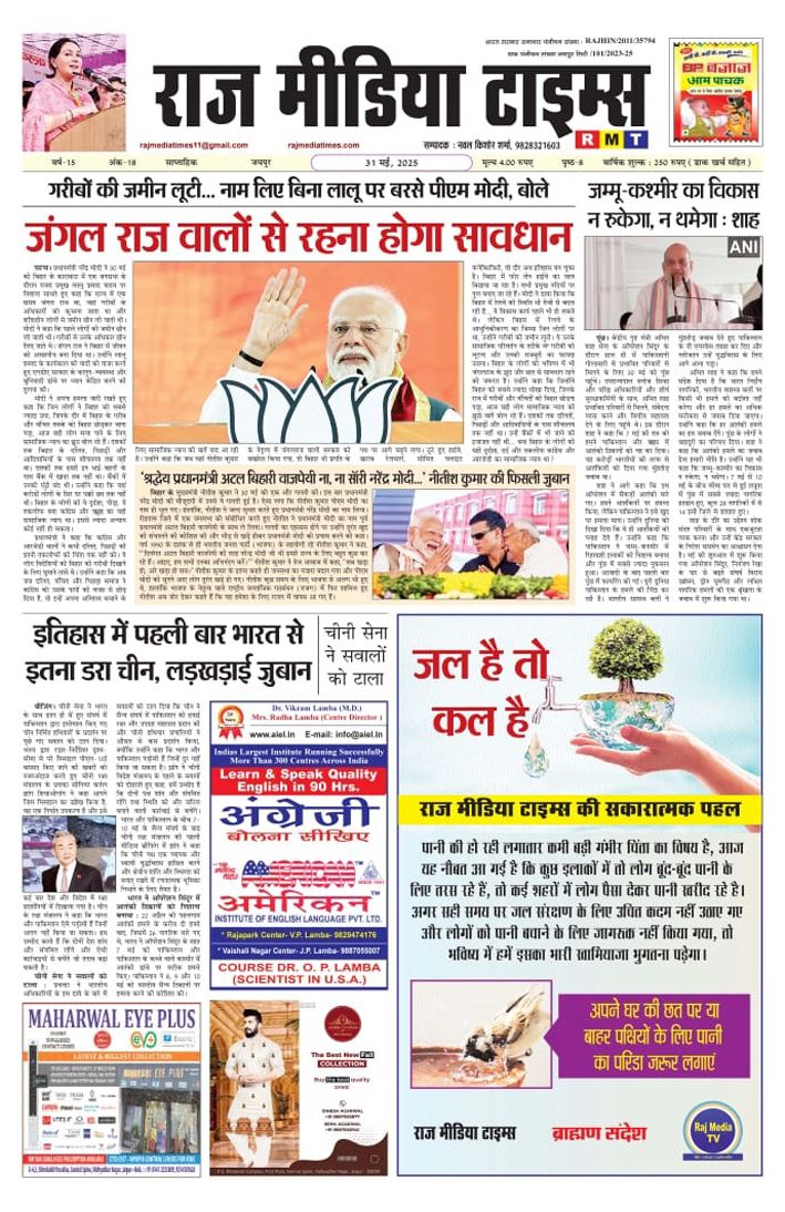 E-Paper E-Paper_31-05-2025 Last updated: May 31, 2025 4:45 am RMT network Share 0 Min Read SHARE TAGGED:E-Paper Sign Up For Daily NewsletterBe keep up! Get the latest breaking news delivered straight to your inbox.[mc4wp_form]By signing up, you agree to our Terms of Use and acknowledge the data practices in our Privacy Policy. You may unsubscribe at any time. Share This Article Facebook Twitter Copy Link Print Share Previous Article E-Paper_31-05-2025 Next Article केंद्रीय स्वास्थ्य एवं परिवार कल्याण मंत्री जेपी नड्डा एवं मुख्यमंत्री भजनलाल शर्मा ने राज्य की नारी शक्ति को विभिन्न योजनाओं के तहत दी कई सौगातें Stay Connected235.3kFollowersLike69.1kFollowersFollow11.6kFollowersPin56.4kFollowersFollow136kSubscribersSubscribe4.4kFollowersFollow - Advertisement - Latest News राज्य सरकार की जनहितकारी पहल: जेडीए अब रिक्त भूखंडों और स्थानों को देगा अल्पावधि किराये पर Jaipur March 7, 2026 E-Paper_(07-03-2026) E-Paper March 7, 2026 उद्योगपति सुदेश शर्मा को जन्मदिवस पर दी बधाई Jaipur March 7, 2026 फ़ाइनल में पहुंचा भारत, बेथेल का शतक गया बेकार Sports March 6, 2026 AdvertiseAdvertise with us Newsletters Deal
