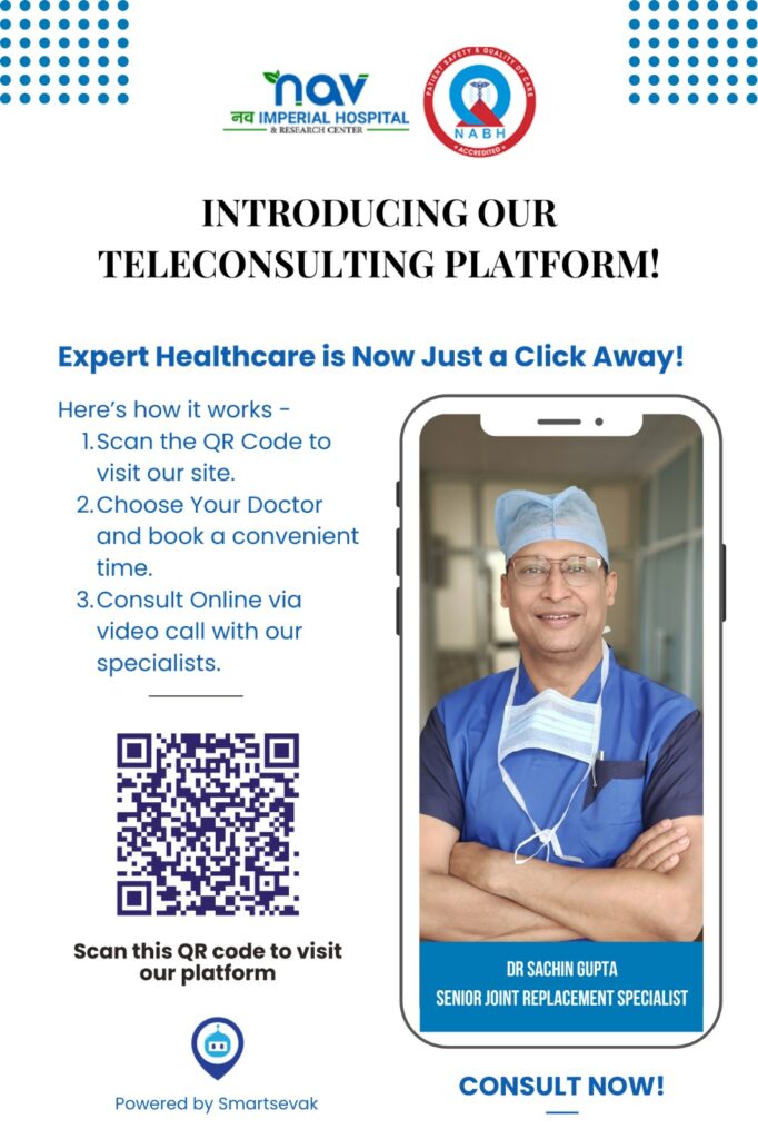 जयपुर। नव इम्पीरियल हॉस्पिटल के वरिष्ठ जॉइंट रिप्लेसमेंट विशेषज्ञ डॉ. सचिन गुप्ता ने अपने मरीजों की सुविधा को ध्यान में रखते हुए एक नया ई-पोर्टल लॉन्च किया है, जिसके माध्यम से दूरदराज के इलाकों में रहने वाले मरीज और वे लोग, जो किसी कारणवश क्लिनिक नहीं आ सकते, आसानी से परामर्श प्राप्त कर सकेंगे।